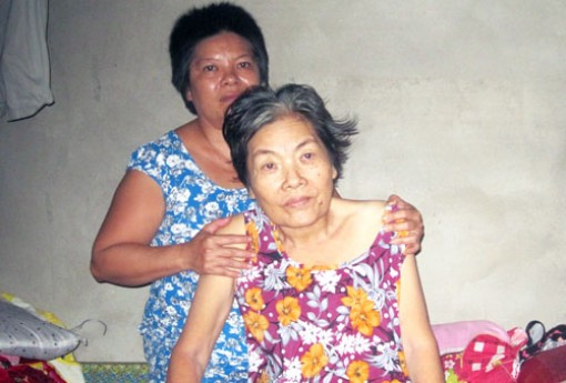 Bà Ren không thể tự ngồi được, phải nhờ con gái đỡ dậy. |