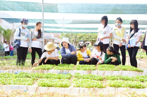 Bà Mayu hỗ trợ học sinh trồng rau hữu cơ. Ảnh: C.Trúc