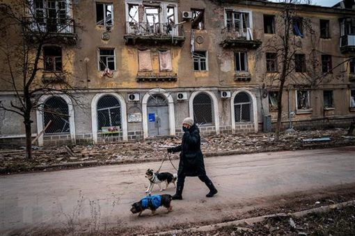 Một người dân di chuyển qua tòa nhà bị hư hại trong xung đột Nga-Ukraine tại Chasiv Yar, miền Đông Ukraine. (Ảnh: AFP/TTXVN)