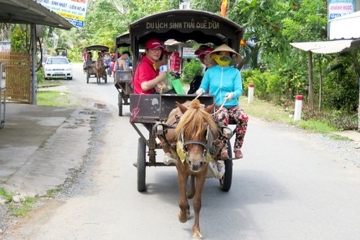 Du khách Hồng Kông đi xe ngựa trên đường quê xã Tân Thạch, huyện Châu Thành.