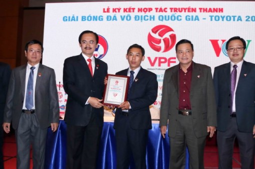 | Ông Phạm Phú Hoà (bìa phải) tại lễ ký kết tài trợ mùa giải 2015. Ảnh: N.K |