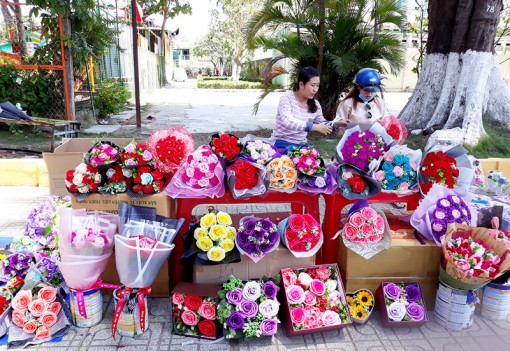 Bên cạnh hoa tươi, các thể loại hoa thủ công cũng phong phú mẫu mã. Ngoài hoa giấy, còn có loại hoa sáp, hoa kết bằng vải, hoa mạ vàng rất sinh động và tinh xảo. Giá hoa thủ công gần tương đương hoa tươi nhưng để được lâu dài nên cũng thu hút khách hàng. Giá một bó khoảng 20 bông từ 230 ngàn đồng trở lên.
