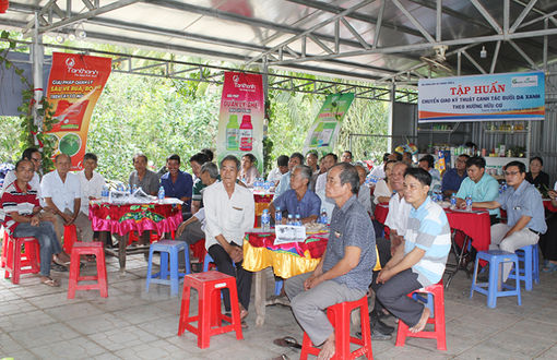 BDK.VN - Chiều 25-9-2023, Hội Nông dân xã Thành Thới A (Mỏ Cày Nam) phối hợp Trung tâm Khuyến nông và tư vấn dịch vụ nông nghiệp tỉnh, Công ty TNHH Thương mại Tân Thành và TNHH Green Power tổ chức tập huấn kỹ thuật canh tác bưởi da xanh theo hướng hữu cơ cho hội viên (HV), nông dân ở địa phương.