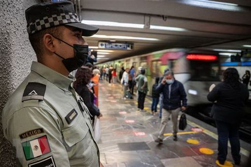 Binh sĩ thuộc Lực lượng Vệ binh Quốc gia Mexico gác tại ga tàu điện ngầm Bellas Artes ở Mexico City. Ảnh: AFP/TTXVN