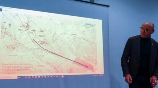 Chủ tịch Hãng hàng không quốc tế Ukraine đứng bên bản đồ có lịch trình bay của chuyến bay xấu số. Ảnh: Reuters